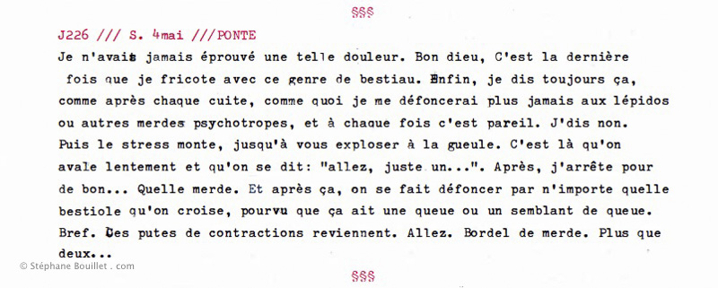 Je n'avais jamais éprouvé une telle douleur. Bon dieu, C'est la dernière fois que je fricote avec ce genre de bestiau. Enfin, je dis toujours ça, comme après chaque cuite, comme quoi je me défoncerai plus jamais aux lépidos ou autres merdes psychotropes, et à chaque fois c'est pareil. J'dis non. Puis le stress monte, jusqu'à vous exploser à la gueule. C'est là qu'on avale lentement et qu'on se dit: "allez, juste un…". Après, j'arrête pour de bon… Quelle merde. Et après ça, on se fait défoncer par n'importe quelle bestiole qu'on croise, pourvu que ça ait une queue ou un semblant de queue. Bref. Ces putes de contractions reviennent. Allez. Bordel de merde. Plus que deux…