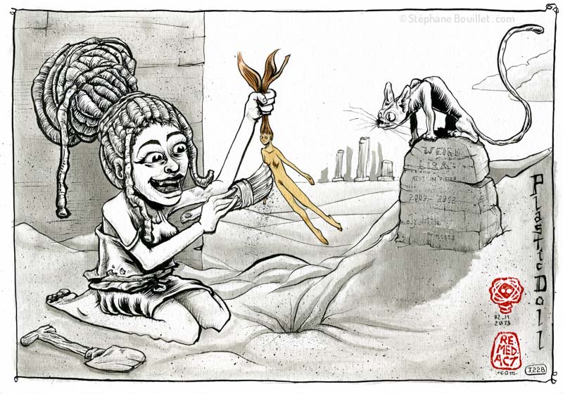 légende: une fille, Sencha, découvre émerveillée une Barbie en creusant une tombe, devant le regard médusé de Spynx le chat