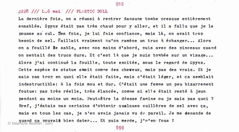 La dernière fois, on a réussi à rentrer dans une tombe presque entièrement ensablée. Spynx était pas très chaud pour y aller, et il a fallu que je le pousse au cul. Des fois, je lui fais confiance, mais là, on avait trop besoin de sel. Fallait vraiment qu'on ramène un truc à échanger… Alors on a fouillé le sable, avec nos mains d'abord, puis avec des pinceaux quand on sentait des trucs durs. Et c'est 1à que je suis tombée sur un visage… Alors j'ai continué la fouille, toute excitée, sous le regard de Spynx. Cette espèce de statue avait comme des cheveux, mais pas des vrais. Et je sais pas trop en quoi elle était faite, mais c'était léger, et ça semblait indestructible: à la fois mou et dur. C'était une femme un peu bizarrement foutue: pas très réelle, très élancée, comme si elle était restée à jeun pendant au moins un mois. Peut-être la déesse famine ou je sais pas quoi ? Bref, j'étais pas certains d'obtenir quelques cuillères de sel avec ça, mais en tous les cas, je n'en avais jamais vu de pareil. Je me demande de quand ça pouvait bien dater… Et puis merde, j'm'en' fous !