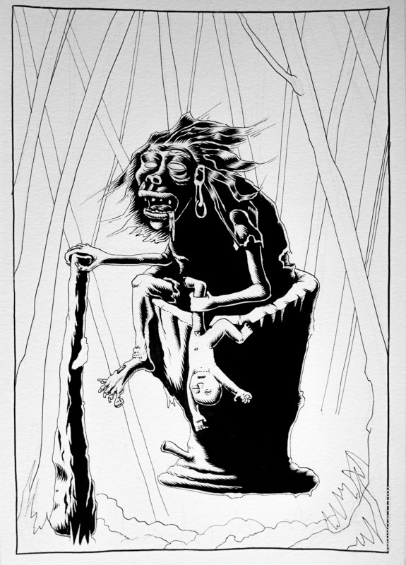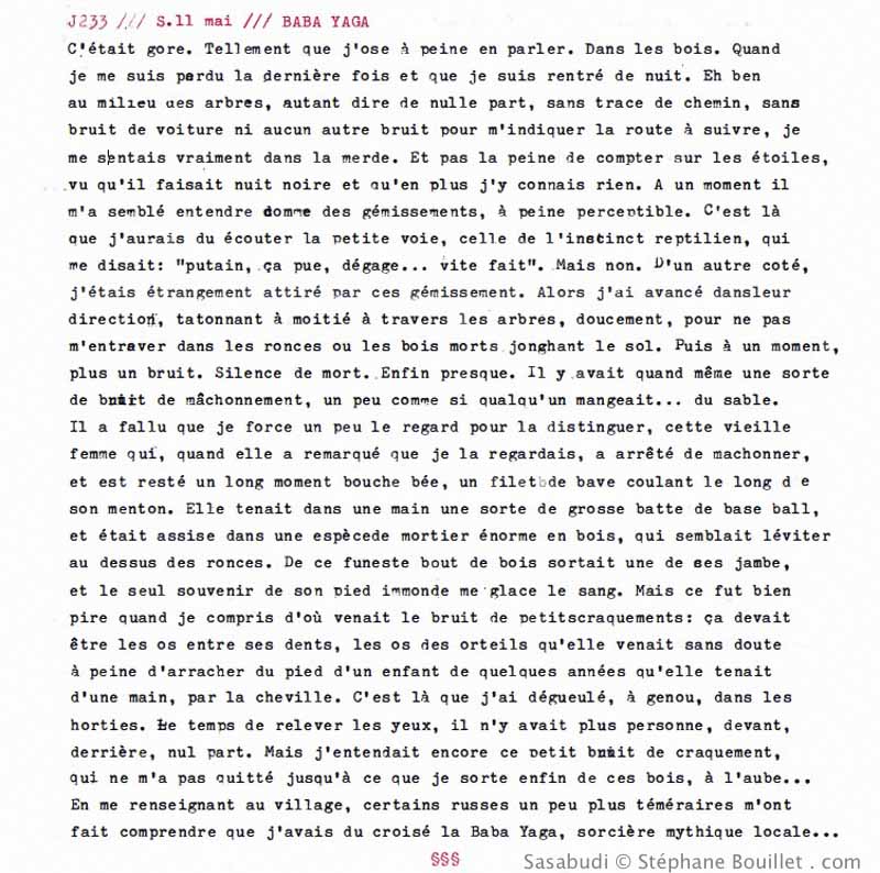 C'était gore. Tellement que j'ose à peine en parler. Dans les bois. Quand je me suis perdu la dernière fois et que je suis rentré de nuit. Eh ben au milieu des arbres, autant dire de nulle part, sans trace de chemin, sans bruit de voiture ni aucun autre bruit pour m'indiquer la route à suivre, je me sentais vraiment dans la merde. Et pas la peine de compter sur les étoiles, vu qu'il faisait nuit noire et qu'en plus j'y connais rien. À un moment il m'a semblé entendre comme des gémissements, à peine perceptible. C'est là que j'aurais dû écouter la petite voix, celle de l'instinct reptilien, qui me disait: "putain, ça pue, dégage… vite fait". Mais non. D'un autre coté, j'étais étrangement attiré par ces gémissement. Alors j'ai avancé dans leur direction, tatonnant à moitié à travers les arbres, doucement, pour ne pas m'entraver dans les ronces ou les bois morts jonchant le sol. Puis à un moment, plus un bruit. Silence de mort. Enfin presque. Il y avait quand même une sorte de bruit de mâchonnement, un peu comme si quelqu'un mangeait… du sable. Il a fallu que je force un peu le regard pour la distinguer, cette vieille femme qui, quand elle a remarqué que je la regardais, a arrêté de mâchonner, et est restée un long moment bouche bée, un filet de bave coulant le long de son menton. Elle tenait dans une main une sorte de grosse batte de baseball, et était assise dans une espèce de mortier énorme en bois, qui semblait léviter au dessus des ronces. De ce funeste bout de bois sortait une de ses jambes, et le seul souvenir de son pied immonde me glace le sang. Mais ce fut bien pire quand je compris d'où venait le bruit de petits craquements: ça devait être les os entre ses dents, les os des orteils qu'elle venait sans doute à peine d'arracher du pied d'un enfant de quelques années qu'elle tenait d'une main, par la cheville. C'est là que j'ai dégueulé, à genou, dans les horties. Le temps de relever les yeux, il n'y avait plus personne, devant, derrière, nul part. Mais j'entendait encore ce petit bruit de craquements, qui ne m'a pas quitté jusqu'à ce que je sorte enfin de ces bois, à l'aube… En me renseignant au village, certains russes un peu plus téméraires m'ont fait comprendre que j'avais du croisé la Baba Yaga, sorcière mythique locale…