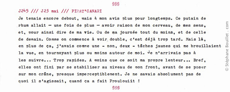 Je tenais encore debout, mais à mon avis plus pour longtemps. Ce putain de rhum allait – une fois de plus – avoir raison de mon cerveau, de mes sens, et, pour ainsi dire de ma vie. Ou de ma journée tout du moins, et de celle de demain. Comme on commence à voir double, c’est déjà trop tard. Mais là, en plus de ça, j’avais comme une – non, deux – tâches jaunes qui me brouillaient la vue, en tournoyant plus ou moins autour de moi. Je n’arrivais pas à les suivre… Trop rapides. A moins que ce ne soit ma propre lenteur… Bref, elles ont fini par se stabiliser au niveau de mon front, avant de se poser sur mon crâne, presque imperceptiblement. Je ne savais absolument pas de quoi il s’agissait, quand ça a fait Proulouiit !