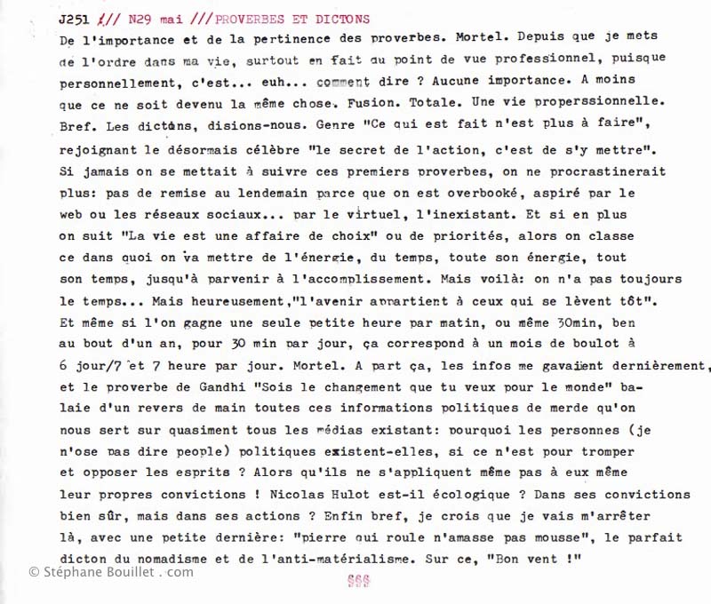 De l'importance et de la pertinence des proverbes. Mortel. Depuis que je mets de l'ordre dans ma vie, surtout en fait du point de vue professionnel, puisque personnellement, c'est… euh… comment dire ? Aucune importance. À moins que ce ne soit devenu la même chose. Fusion. Totale. Une vie properssionnelle. Bref. Les dictons, disions-nous. Genre "Ce qui est fait n'est plus à faire", rejoignant le désormais célèbre "le secret de l'action, c'est de s'y mettre". Si jamais on se mettait à suivre ces premiers proverbes, on ne procrastinerait plus: pas de remise au lendemain parce qu'on est overbooké, aspiré par le web ou les réseaux sociaux… par le virtuel, l'inexistant. Et si en plus on suit "La vie est une affaire de choix" ou de priorités, alors on classe ce dans quoi on va mettre de l'énergie, du temps, toute son énergie, tout son temps, jusqu'à parvenir à l'accomplissement. Mais voilà: on n'a pas toujours le temps… Mais heureusement, "l'avenir appartient à ceux qui se lèvent tôt". Et même si l'on gagne une seule petite heure par matin, ou même 30min, ben au bout d'un an, pour 30 min par jour, ça correspond à un mois de boulot à 6 jours/7 "et 7 heures par jour. Mortel. À part ça, les infos me gavaient dernièrement, et le proverbe de Gandhi "Sois le changement que tu veux pour le monde" balaie d'un revers de main toutes ces informations politiques de merde qu'on nous sert sur quasiment tous les médias existants: pourquoi les personnes (je n'ose pas dire people) politiques existent-elles, si ce n'est pour tromper et opposer les esprits ? Alors qu'ils ne s'appliquent même pas à eux même leur propres convictions ! Nicolas Hulot est-il écologique ? Dans ses convictions bien sûr, mais dans ses actions ? Enfin bref, je crois que je vais m'arrêter là, avec une petite dernière: "Pierre qui roule n'amasse pas mousse", le parfait dicton du nomadisme et de l'anti-matérialisme. Sur ce, "Bon vent !"