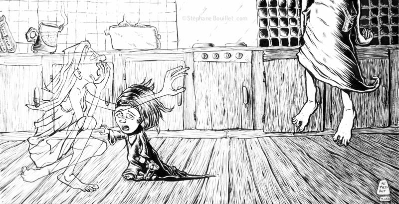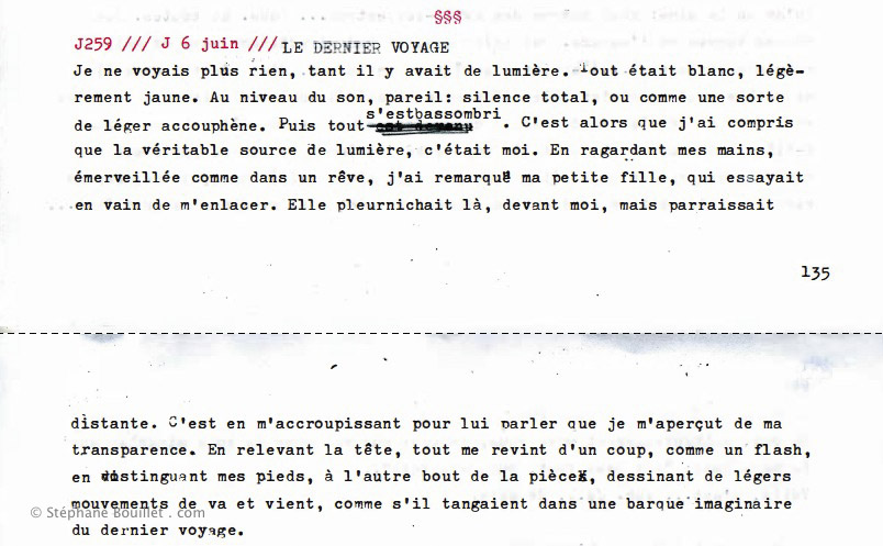 Je ne voyais plus rien, tant il y avait de lumière. Tout était blanc, légèrement jaune. Au niveau du son, pareil: silence total, ou comme une sorte de léger acouphène. Puis tout s'est assombri c'est alors que j'ai compris que la véritable source de lumière, c'était moi. En regardant mes mains, émerveillée comme dans un rêve, j'ai remarqué ma petite fille, qui essayait en vain de m'enlacer. Elle pleurnichait là, devant moi, mais paraissait distante. C'est en m'accroupissant pour lui parler que je m'aperçus de ma transparence. En relevant la tête, tout me revint d'un coup, comme un flash, en distinguant mes pieds, à l’autre bout de la pièce, dessinant de légers mouvements de va et vient, comme s'il tanguaient dans une barque imaginaire du dernier voyage.