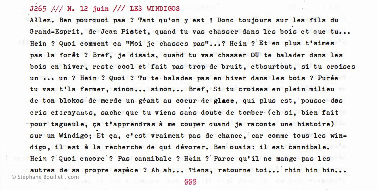 Allez. Ben pourquoi pas ? Tant qu'on y est ! Donc toujours sur les fils du Grand-Esprit, de Jean Pictet, quand tu vas chasser dans les bois et que tu… Hein.? Quoi comment ça "Moi je chasse pas"… ? Hein ? Et en plus t'aimes pas la forêt ? Bref, je disais, quand tu vas chasser OU te balader dans les bois en hiver, reste cool et fait pas trop de bruit, et surtout, si tu croises un… un ? Hein ? Quoi ? Tu te balades pas en hiver dans les bois ? Purée tu vas t'la fermer, sinon… sinon… Bref, Si tu croises en plein milieu de ton blokos de merde un géant au cœur de glace, qui plus est, pousse des cris effrayants, sache que tu viens sans doute de tomber (eh si, bien fait pour ta gueule, ça t'apprendras à me couper quand je raconte une histoire) sur un Wendigo. Et ça, c'est vraiment pas de chance, car comme tous les wendigos, il est à la recherche de qui dévorer. Ben ouais: il est cannibale. Hein ? Quoi encore ? Pas cannibale? Hein? Parce qu'il ne mange pas les autres de sa propre espèce ? Ah ah… Tiens, retourne toi… rhin hin hin…