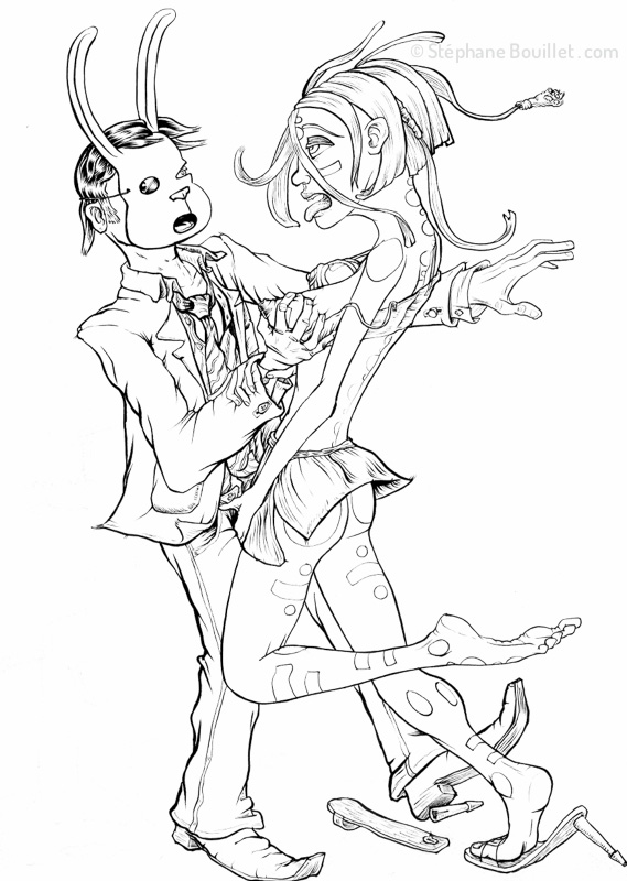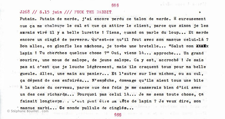 Putain. Putain de merde, j'ai encore perdu ce talon de merde. Heureusement que ça me chaloupe le cul et que ça attire le client, parce que sinon je les aurais viré il y a belle lurette ! Tiens, quand on parle du loup… Et merde encore un cinglé de pervers… Qu'est-ce qu'il fout avec son masque celui-là ? Bon allez, on gonfle les nichons, je tombe une bretelle… salut mon lapin ! Tu cherches quelque chose ? Oui, viens là… approche… Un grand sourire, une moue de salope, de jeune salope. Ça y est, accroché ! Je sais pas si c'est que je louche légèrement, mais ils craquent tous pour ma belle gueule. Allez, une main au panier… Et l'autre sur les nichons, ou au cul, ça dépend de ces enfoirés… N'empêche, dommage qu'ils aient tous une bite à la place du cerveau, parce que des fois je me casserais bien d'ici avec un des ces richards… Pourquoi pas celui là… Je me sens toute chose, ça faisait longtemps… C'est peut-être sa tête de lapin ? Je veux dire, son masque zarbi… Ce monde pullule de cinglés…