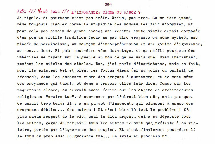 Je rigole. Et pourtant c'est pas drôle. Enfin, pas très. Ça me fait quand même toujours rigoler comme la stupidité des hommes les fait s'opposer. Et pour cela pas besoin de grand chose: une recette toute simple serait composée d'un peu de vieille tradition (pour ne pas dire croyance ou même mythe), une pincée de narcissisme, un soupçon d'incompréhension et une goutte d'ignorance, ou non… deux. Et puis peut-être même davantage. Et ça suffit pour que des imbéciles se tapent sur la gueule au nom de je ne sais quel dieu inexistant, pendant les siècles des siècles. Bon, j'ai parlé d'inexistence, mais en fait, non, ils existent bel et bien, ces foutus dieux (si au moins on parlait de déesses), dans les caboches vides des croyant à outrances, et ce sont même ces croyances qui tuent, et donc à travers elles leur(s) dieu(x). Comme sur les paquets de clopes, on devrait aussi écrire sur les objets et architectures religieuses "croire tue". À commencer par l'abruti bien sûr, mais pas que. Ce serait trop beau: il y a un paquet d 'innocents qui clamsent à cause des croyances débiles… des autres ! Et c'est bien là tout le problème ! Y'a plus aucun respect de la vie, seul le dieu argent, qui a su dépasser tous les autres, gagne du terrain: tous les autres ne sont que prétexte à sa victoire, portée par l'ignorance des peuples. Et c'est finalement peut-être là le fond du problème: L'Ignorance tue… La suite au prochain n°.