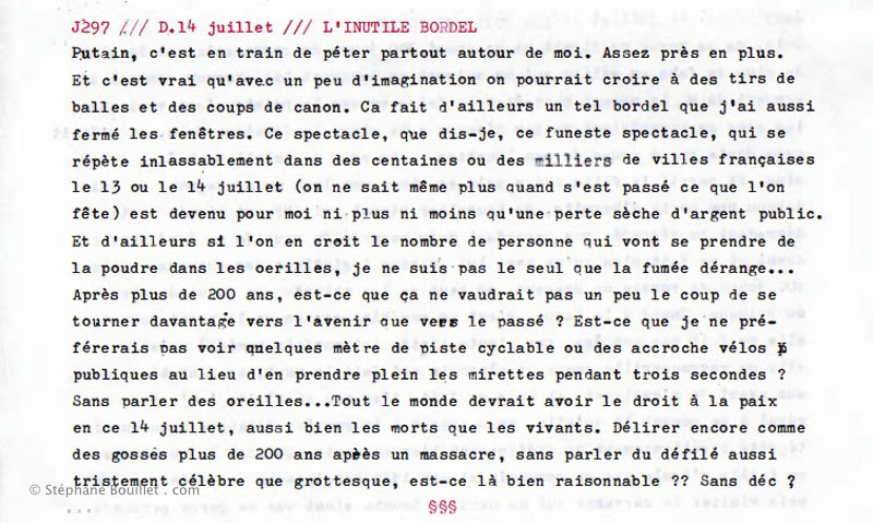 Putain, c'est en train de péter partout autour de moi. Assez près en plus. Et c'est vrai qu'avec un peu d'imagination on pourrait croire à des tirs de balles et des coups de canon. Ça fait d'ailleurs un tel bordel que j'ai aussi fermé les fenêtres. Ce spectacle, que dis-je, ce funeste spectacle, qui se répète inlassablement dans des centaines ou des milliers de villes françaises le 13 ou le 14 juillet (on ne sait même plus quand s'est passé ce que l'on fête) est devenu pour moi ni plus ni moins qu'une perte sèche d'argent public. Et d'ailleurs si l'on en croit le nombre de personnes qui vont se prendre de la poudre dans les oreilles; je ne suis pas le seul que la fumée dérange… Après plus de 200 ans, est-ce que ça ne vaudrait pas un peu le coup de se tourner davantage vers l'avenir que vers le passé ? Est-ce que je ne préférerais pas voir quelques mètres de piste cyclable ou des accroche-vélos publiques au lieu d'en prendre plein les mirettes pendant trois secondes ? Sans parler des oreilles… Tout le monde devrait avoir le droit à la paix en ce 14 juillet, aussi bien les morts que les vivants. Délirer encore comme des gosses plus de 200 ans après un massacre, sans parler du défilé aussi tristement célèbre que grotesque, est-ce là-bien raisonnable ?? Sans déc?