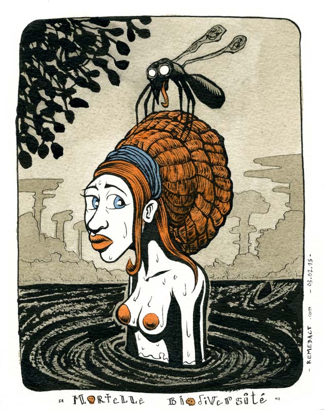 légende : une fille aux seins nus se baigne alors qu'un requin s'approche et qu'un moustique géant s'est posé sur ses rasta rousses
