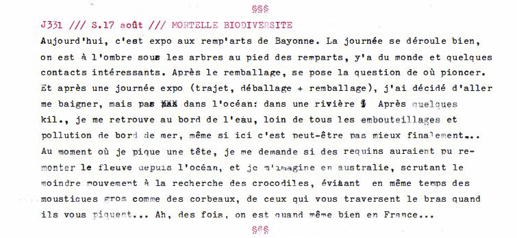 Au aujourd’hui, c’est expo aux Remp'Arts de Bayonne. La journée se déroule bien, on est à l'ombre sous les arbres au pied des remparts, y'a du monde et quelques contacts intéressants. Après le remballage, se pose la question : où pioncer ? Et après une journée expo (trajet, déballage + remballage), j'ai décidé d'aller me baigner, mais pas dans l'océan ! Dans une rivière ! Après a quelques kil., je me retrouve au bord de l’eau, loin de tous les embouteillages et pollution de bord de mer, même si ici c'est peut-être pas mieux finalement, niveau pollution… Au moment où je pique une tête, je me demande si des requins auraient pu remonter le fleuve depuis l'océan, et je m'imagine en Australie, scrutant le moindre mouvement à la recherche des crocodiles, évitant en même temps des moustiques gros comme des corbeaux, de ceux qui vous traversent le bras quand ils vous piquent… Ah, des fois, on est quand même bien en France…