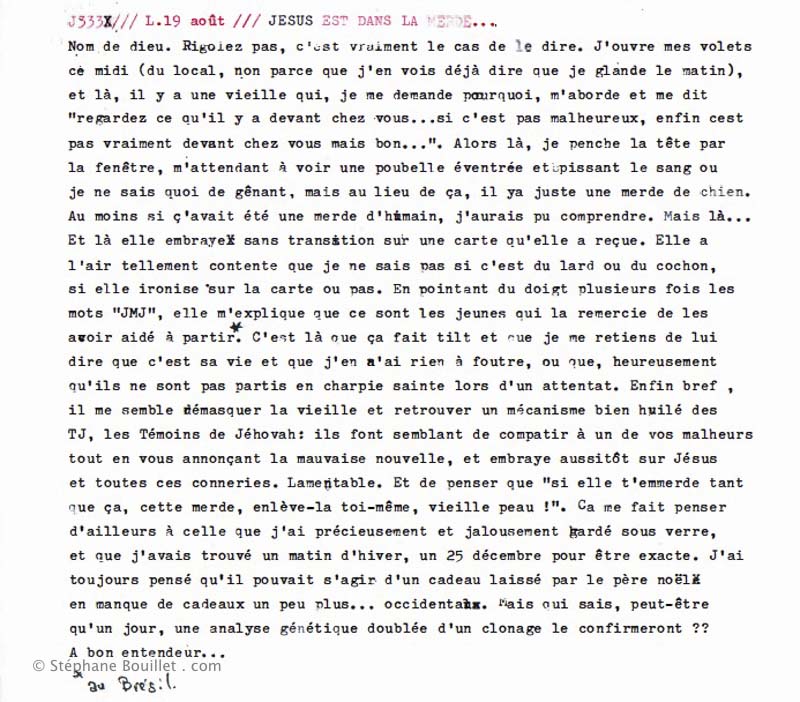 Nom de dieu. Rigolez pas, c'est vraiment le cas de le dire. J'ouvre mes volets ce midi (du local, non parce que j'en vois déjà dire que je glande le matin), et là, il y a une vieille qui, je me demande pourquoi, m'aborde et me dit "regardez ce qu'il y a devant chez vous… si c'est pas malheureux, enfin cest pas vraiment devant chez vous mais bon…". Alors là, je penche la tête par la fenêtre, m'attendant à voir une poubelle éventrée et pissant le sang ou je ne sais quoi de gênant, mais au lieu de ça, il y a juste une merde de chien. Au moins si ç'avait été une merde d'humain, j'aurais pu comprendre. Mais là… Et là elle embraye sans transition sur une carte qu'elle a reçue. Elle a l'air tellement contente que je ne sais pas si c'est du lard ou du cochon, si elle ironise sur la carte ou pas. En pointant du doigt plusieurs fois les mots "JMJ", elle m'explique que ce sont les jeunes qui la remercient de les avoir aidé à partir *. C'est là que ça fait tilt et que je me retiens de lui dire que c'est sa vie et que j'en n'ai rien à foutre, ou que, heureusement qu'ils ne sont pas partis en charpie sainte lors d'un attentat. Enfin bref, il me semble démasquer la vieille et retrouver un mécanisme bien huilé des TJ, les Témoins de Jéhovah: ils font semblant de compatir à un de vos malheurs tout en vous annonçant la mauvaise nouvelle, et embraye aussitôt sur Jésus et toutes ces conneries. Lamentable. Et de penser que "si elle t'emmerde tant que ça, cette merde, enlève-la toi-même, vieille peau !" . Ça me fait penser d'ailleurs à celle que j'ai précieusement et jalousement gardé sous verre, et que j'avais trouvé un matin d'hiver, un 25 décembre pour être exacte. J'ai toujours pensé qu'il pouvait s'agir d'un cadeau laissé par le père noël en manque de cadeau