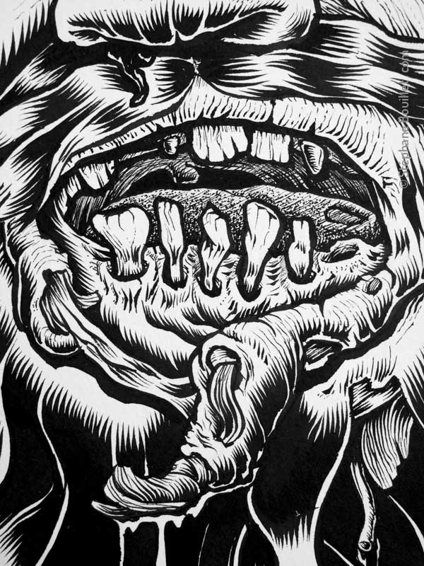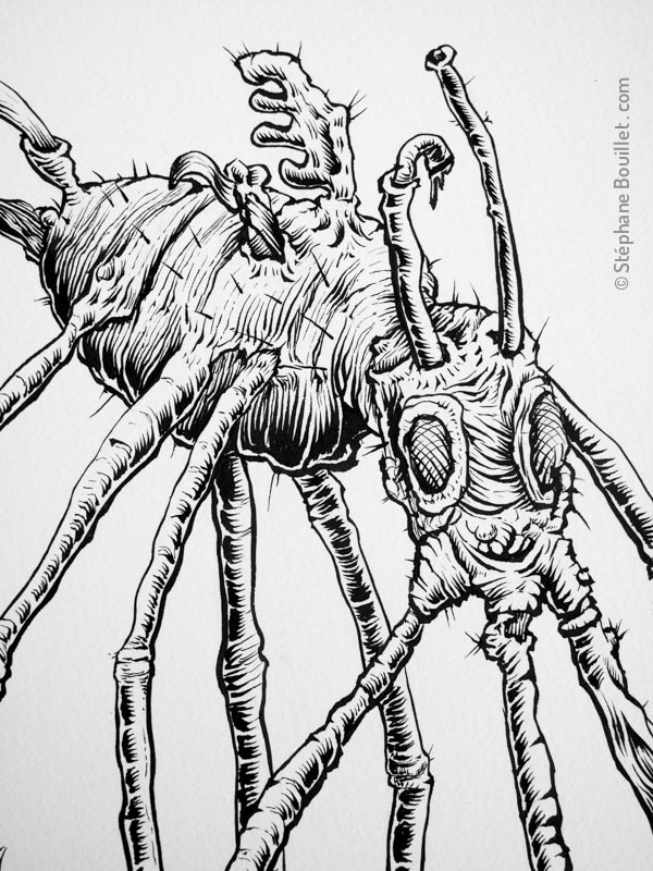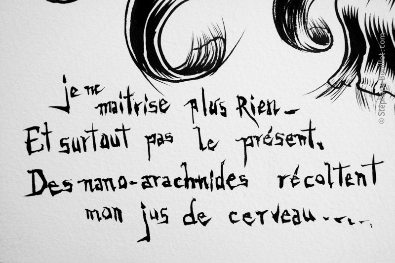 J'ai failli. Failli commencer ce billet sasabudique vers 15h. Et puis, j'ai hésité, tremblant, irrésistiblement attiré par mon écran d'ordinateur, son clavier, sa tablette graphique.i. Bref, j'ai failli. Et près de 3 heures plus tard, je commence enfin ce billet, mi-lobotome, mi-zombie, avec du jus noirâtre de cervelle en décomposition qui me coule des oreilles et des yeux, du nez, de partout. Je ne maîtrise plus rien, et surtout pas le présent. Des nano-arachnides récoltent mon jus de cerveau. J'ai froid. Froid à la tête, comme une espèce de rhum de cerveau. Mais je sais bien que c'est impossible, que je ne sentirai plus jamais rien dans ce crâne qui n'est plus qu'un fromage ramolli: entre puanteur et trous de souris biomécaniques. Internet m'a sodomisé le crâne. Trou d'entrée: les yeux. Trou de sortie: le néant. Toutes ces saloperies de-bestioles sont en train de se nourrir de mes souvenirs, de ma nevro-énergie, de mon passé. Elles n'arrêtent pas de sucer et d'aspirer, laissant bientôt une coquille vide, à la tête d'un mollusque au crâne d’œuf, dont la seule erreur aura été de se faire juste un dernier petit shoot. Juste un. Un petit dernier…