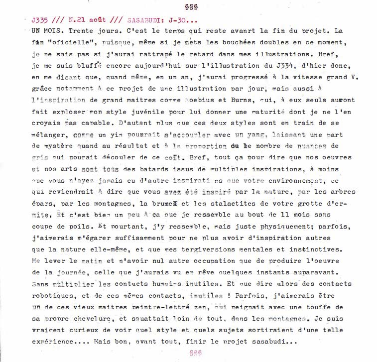 UN MOIS . Trente jours. C'est le temps qui reste avant la fin du projet. La fin "officielle", puisque, même si je mets les bouchées doubles en ce moment, je ne sais pas si j'aurai rattrapé le retard dans mes illustrations. Bref, je me suis bluffé encore aujourd'hui sur l'illustration du J334, d'hier donc, en me disant que, quand même, en un an, j'aurai progressé à la vitesse grand V. grâce notamment à ce projet de une illustration par jour; mais aussi à l'inspiration de grand maîtres comme Moebius et Burns, qui, à eux seuls auront fait exploser mon style juvénile pour lui donner une maturité dont je ne l'en croyais pas capable. D'autant plus que ces deux styJes sont en train de se mélanger, comme un yin pourrait s’accoupler avec un yang , laissant une part de mystère quand au résultat et à la proportion du nombre de nuances de gris qui pourrait découler de ce coït. Bref, tout ça pour dire que nos œuvres et nos arts sont tous des bâtards issus de multiples inspirations, à moins que vous n'ayez jamais eu d'autres inspirations que votre environnement, ce qui reviendrait à dire que vous avez été inspiré par la nature, par les arbres épars, par les montagnes, la brume et les stalactites de votre grotte d'ermite. Et c'est bien un peu à ça que je ressemble au bout de 11 mois sans coupe de poils. Et pourtant, j'y ressemble, mais juste physiquement; parfois, j'aimerais m'égarer suffisamment pour ne plus avoir d’inspiration autres que la nature elle-même, et que mes tergiversions mentales et instinctives. Me lever le matin et n'avoir nul autre occupation que de produire l’œuvre de la journée, celle que j'aurais vu en rêve quelques instants auparavant. Sans multiplier les contacts humains inutiles. Et que dire alors des contacts robotiques, et de ces mêmes contacts, inutiles ! Parfois, j'aimerais être un de ces