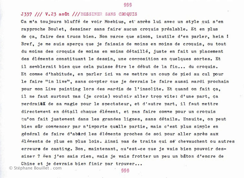 Ça m'a toujours bluffé de voir Moebius, et après lui avec un style qui s'en rapproche, Boulet, dessiner sans faire aucun croquis préalable. Et en plus de ça, faire des trucs bien. Non parce que sinon, inutile d'en parler, hein ! Bref, je me suis aperçu que je faisais de moins en moins de croquis, ou tout du moins des croquis de moins en moins détaillés, juste en fait un placement des éléments constituant le dessin, une composition en quelques sortes. Et il semblerait bien que cela puisse être le début de la fin… du croquis. Et comme d'habitude, en parler ici va me mettre un coup de pied au cul pour le faire "in live", sans compter que je devrais le faire aussi mardi prochain pour mon Live painting lors des mardis de l'insolite. Et quand on fait ça, il ne faut surtout pas (je crois) vouloir aller trop vite: d'une part, ça perdrait de sa magie pour le spectateur, et d'autre part, il faut mettre directement en détail chaque élément, et pas faire comme pour un croquis qu'on fait justement dans les grandes lignes, sans détails. Ensuite, on peut bien sûr commencer par n'importe quelle partie, mais c'est plus simple en général de faire d’abord les éléments proches de soi pour aller après aux éléments de plus en plus loin. Ainsi pas de traits qui se chevauchent ou autres erreurs de casting. Bon, maintenant, qu’est-ce que je vais bien pouvoir dessiner ? Ben j'en sais rien, mais je vais frotter un peu un bâton d'encre de Chine et je devrais bien finir par trouver… EDITO : Bon ben finalement, C'est Boulet et une vidéo que j'avais vu de lui faisant un Cthulhu (le dieu-monstre de H.P. Lovecraft) qui m'a inspirer un vague portrait de ce monstre, davantage ici en poulpe qu'en dieu mangeur de poisson à ses heures perdues.