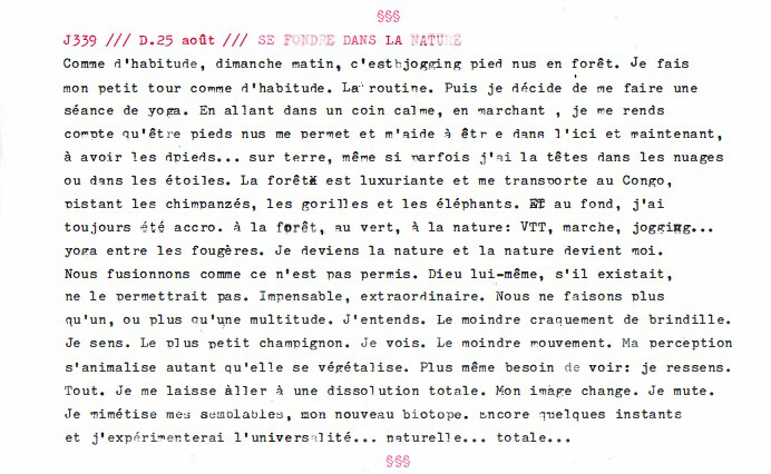 Comme d'habitude, dimanche matin, c'est jogging pied nus en forêt. Je fais mon petit tour comme d'habitude. La routine. Puis je décide de me faire une séance de yoga. En allant dans un coin calme, en marchant, je me rends compte qu'être pieds nus me permet et m'aide à être dans l'ici et maintenant, à avoir les pieds… sur terre, même si parfois j'ai la tête dans les nuages ou dans les étoiles. La forêt est luxuriante et me transporte au Congo, pistant les chimpanzés, les gorilles et les éléphants. Et au fond, j'ai toujours été accro. à la forêt, au vert, à la nature: VTT, marche, jogging… yoga entre les fougères. Je deviens la nature et la nature devient moi. Nous fusionnons comme ce n'est pas permis. Dieu lui-même, s'il existait, ne le permettrait pas. Impensable, extraordinaire. Nous ne faisons plus qu'un, ou plus qu'une multitude. J'entends. Le moindre craquement de brindille. Je sens. Le plus petit champignon. Je vois. Le moindre mouvement. Ma perception s'animalise autant qu'elle se végétalise. Plus même besoin de voir: je ressens. Tout. Je me laisse aller à une dissolution totale. Mon image change. Je mute. Je mimétise mes semblables, mon nouveau biotope. Encore quelques instants et j'expérimenterai l'universalité… naturelle… totale…