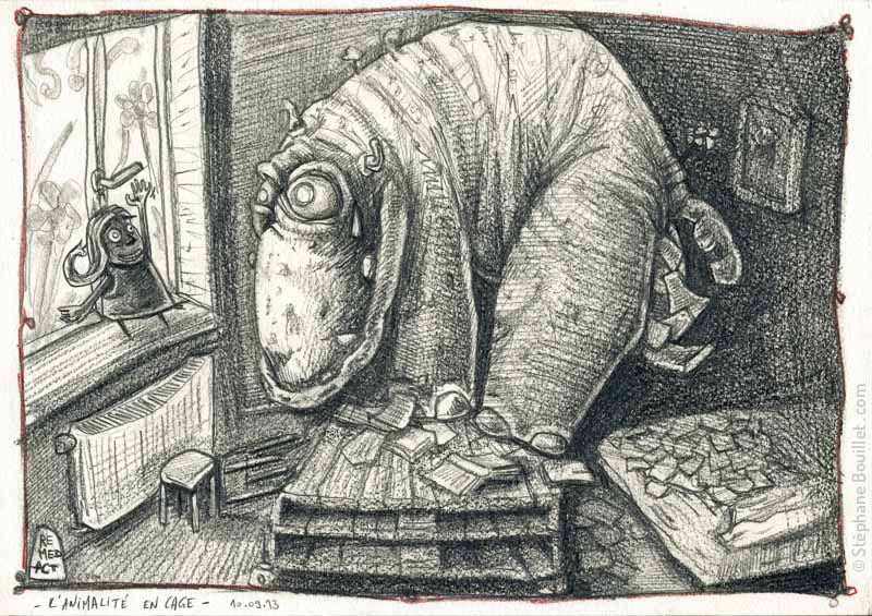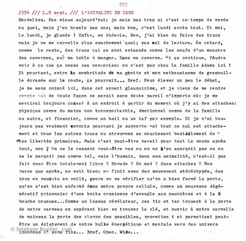 Bordeliou. Pas mieux aujourd'hui: je sais pas trop si c'est ce temps de merde ou guai, mais j'en branle pas une; mais bon, c'est lundi après tout. Et moi, le lundi, je glande ! Enfin, en théorie. Bon, j'ai bien du faire des trucs mais je ne me rappelle plus exactement quoi; pas mal de lecture. En retard, comme le reste, des trucs qui se sont entassés comme les œufs d'un monstre des cavernes, sur ma table à manger. Dans ma caverne. Si ça continue, faudra voir à ce que ça cesse ces conneries: on n'est pas chez la famille Adams ici ! Et pourtant, entre la sombritude de ma grotte et mon enthousiasme de grenouille écrasée sur le route, ça pourrait… Bref. Pour élever un peu le débat, je me sens coincé ici, dans cet appart glauquissime, et je viens de me rendre compte que de toute façon ce serait sans doute pareil n'importe où: je me sentirai toujours coincé à un endroit à partir du moment où j'y ai des attaches: physiques comme du matos non transportable, émotionnel comme de la famille ou autre, et financier, comme un bail ou un taf par exemple. Et je n'ai toujours pas vraiment compris pourquoi je supporte mal tout ce qui est attachement et tous les autres trucs ou streumons se nourrissant bestialement de mes libertés primaires. Mais c'est peut-être pareil pour tout le monde après tout, non ? On ne le ressent peut-être pas ou on ne s'en aperçoit pas ou on ne le perçoit pas comme tel, mais l'humain, dans son animalité, n'est-il pas fait pour être totalement libre ? Nomade ? No mad ? Sans attaches ? Non parce que après, on voit bien: on finit avec des mouvements stéréotypés, des tocs en veux-tu en voilà, genre on va vérifier qu'on a bien fermé la porte, qu'on s'est bien enfermé dans notre propre cellule, comme un neurone dégénératif prisonnier d'une boite crânienne