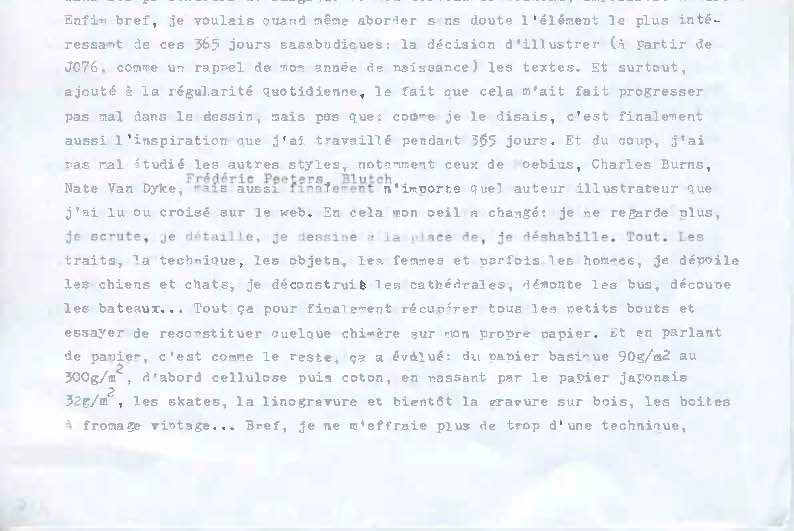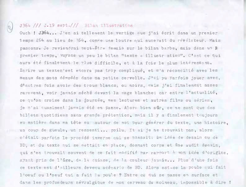 Ouch ! J364… J'en ai tellement le vertige que j'ai écrit dans un premier temps 264 au lieu de 364, comme une loutre qui sucerait du révélateur. Mais passons. Je reviendrai peut-être demain sur le bilan barbe, mais dans un premier temps, voyons un peu le bilan “texte + illustration”. C'est ce qui aura été finalement le plus difficile, et à la fois le plus intéressant. Écrire un texte n'est encore pas trop compliqué, et m'a réconcilié avec les maux des mots démodés dans ma petite cervelle. J'ai pu parfois jouer avec, d'autres fois avoir des trous blancs, ou noirs, mais j'ai finalement assez rarement, voir j'avais séché devant la page blanche; car entre l'actualité, ce qu'on croise dans la journée, mes lectures et autres films ou séries, je n'ai quasiment jamais été en panne. Alors bien sûr, ce ne sont que des billets quotidiens sans grande prétention, mais il y a finalement toujours eu matière dans ma tête ou autour de moi pour générer du texte, une histoire, un coup de gueule, un ressenti … poilu. Et si je ne trouvais pas, alors c’était parfois le procédé inverse qui se passait: une idée de dessin ou de BD, et du texte qui se mettait en place, donnant corps et âge au dit dessin, qui s'en trouvait souvent de ce fait modifié par rapport à mon idée d'origine, ayant pris de l'âge, de la cuisse, de la couleur jaunie … Plus d'une fois ce texte est d’ailleurs devenu scénario de BD. Alors est-ce la poule qui fait l’œuf ou l’œuf qui a fait la poule ? Entre ce qui se passe en surface et dans les profondeurs névralgiques de mon cerveau de moineau, impossible de dire. Enfin bref, je voulais quand même aborder sans doute l'élément le plus intéressant de ces 365 jours sasabudiques: la décision d'illustrer (à partir de J076, comme un rappel de mon année de naissance) les textes. Et surtout, ajouté à la régularité quotidienne, le fait que cela m'ait fait progresser pas mal dans le dessin, mais pas que: comme je le disais, c'est finalement aussi l'inspiration que j'ai travaillée pendant 365 jours. Et du coup, j'ai pas mal étudié les autres styles, notamment ceux de Mœbius, Charles Burns, Frédéric Peeters, Blutch, Nate Van Dyke, mais aussi finalement n'importe quel auteur illustrateur que j’ai lu ou croisé sur le web. En cela mon œil a changé: je ne regarde plus, je scrute, je détaille, je dessine à la place de, je déshabille. Tout. Les traits, la technique, les objets, les femmes et parfois les hommes, je dépoile les chiens et chats, je déconstruis les cathédrales, démonte les bus, découpe les bateaux … Tout ça pour finalement récupérer tous les petits bouts et essayer de reconstituer quelque chimère sur mon propre papier.