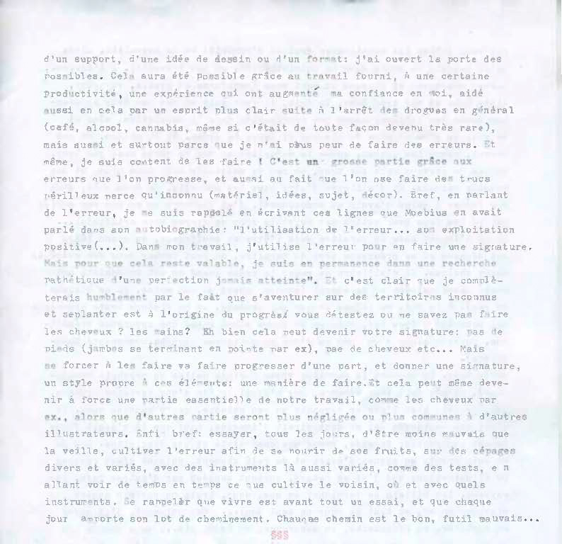 Et en parlant de papier, c'est comme le reste, ça a évolué: du papier basique 90g/m2 au 300g/m2 , d'abord cellulose puis coton, en passant par le papier japonais 32g/m2 , les skates, la linogravure et bientôt la gravure sur bois, les boites à fromage vintage … Bref, je ne m'effraie plus de trop d'une technique,d'un support, d'une idée de dessin ou d'un format: j'ai ouvert la porte des possibles. Cela aura été possible grâce au travail fourni, à une certaine productivité, une expérience qui ont augmenté ma confiance en moi, aidé aussi en cela par un esprit plus clair suite à l'arrêt des drogues en général (café, alcool, cannabis, même si c'était de toute façon devenu très rare), mais aussi et surtout parce que je n'ai plus peur de faire des erreurs. Et même, je suis content de les faire ! C'est en grosse partie grâce aux erreurs que l'on progresse, et aussi au fait que l'on ose faire des trucs périlleux parce qu'inconnu (matériel, idées, sujet, décor …) . Bref, en parlant de l'erreur, je me suis rappelé en écrivant ces lignes que Mœbius en avait parlé dans son autobiographie: “l'utilisation de l'erreur … son exploitation positive (…). Dans mon travail, j'utilise l'erreur pour en faire une signature. Mais pour que cela reste valable, je suis en permanence dans une recherche pathétique d'une perfection jamais atteinte”· Et c'est clair que je compléterais humblement par le fait que s'aventurer sur des territoires inconnus et se planter est à l'origine du progrès: vous détestez ou ne savez pas faire les cheveux ? Les mains ? Eh bien cela peut devenir votre signature: pas de pieds (jambes se terminant en pointe par ex.), pas de cheveux etc … Mais se forcer à les faire va faire progresser d'une part, et donner une signature, un style propre à ces éléments: une manière de faire. Et cela peut même devenir à force une partie essentielle de notre travail, comme les cheveux par ex., alors que d'autres parties seront plus négligées ou plus communes à d'autres illustrateurs. Enfin bref: essayer, tous les jours, d'être moins mauvais que la veille, cultiver l'erreur afin de se nourrir de ses fruits, sur des cépages divers et variés, avec des instruments là aussi variés, comme des tests, en allant voir de temps en temps ce que cultive le voisin, où et avec quels instruments. Se rappeler que vivre est avant tout un essai, et que chaque jour apporte son lot de cheminement. Chaque chemin est le bon, futil mauvais …