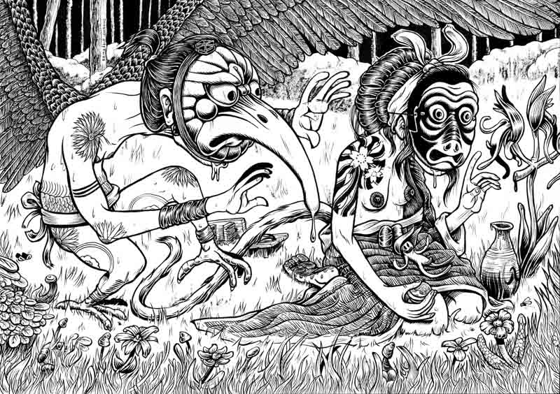 Cette illustration représente un karasu tengu à masque d'oiseau et un Nue à masque de singe (tous deux des yokais, créatures du folkore japonais), sous les trait d'une jolie geisha dont on voit le sein nu et le tatouage. Elle a une queue de singe, tient une tasse de saké et observe des orchidées Orchis simia (singe) alors que le Karasu tengu déploie ses ailes.