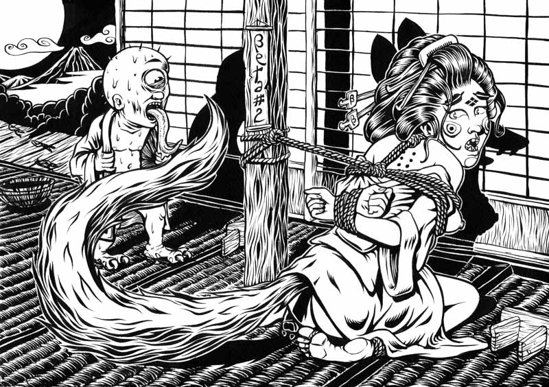 [EDIT] La version couleur est disponible en impression poster A3 et carte postale Kitsune et Hitotsume kozo yokai pour la couverture du fanzine Beta #2 Quand le yokai Kitsune a bu ou est désemparée, elle oublie parfois de cacher sa queue de renard. Ici elle était transformée en geisha attachée en bondage shibari dans une […]