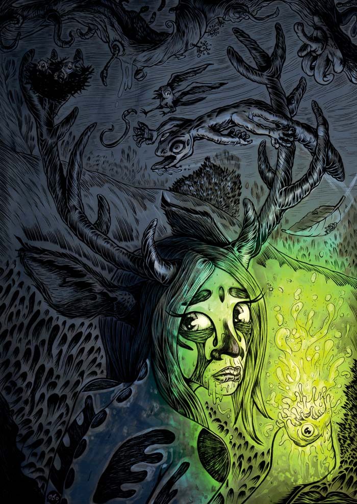 En pleine nuit, une femme biche tachetée et cornue mange une sorte de poulpe phosphorescent.