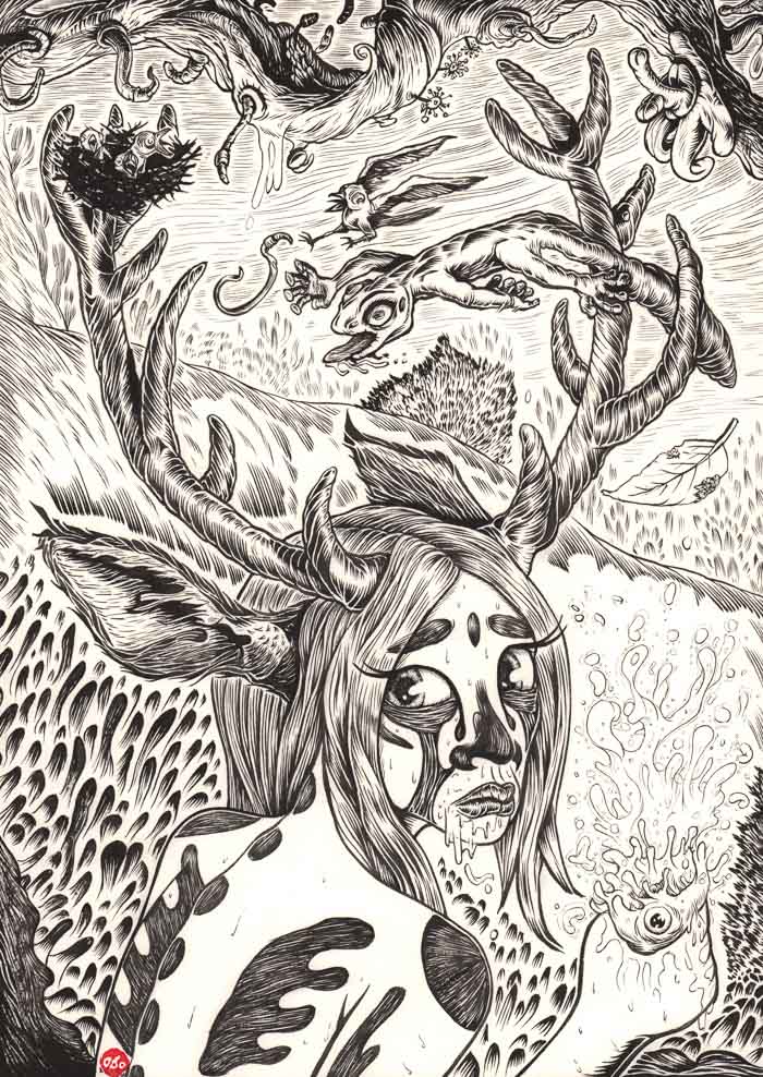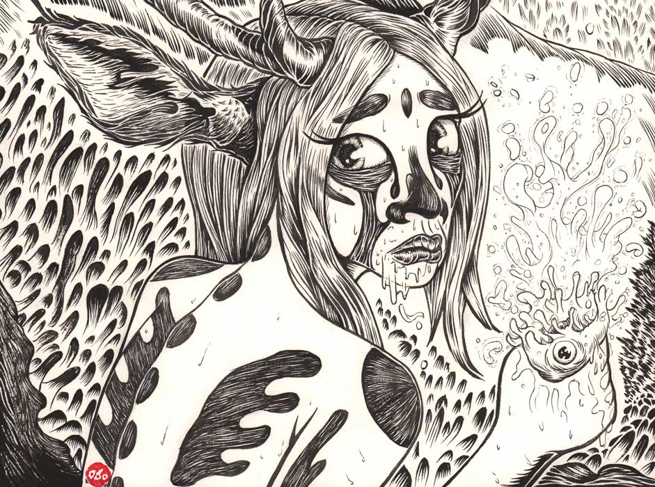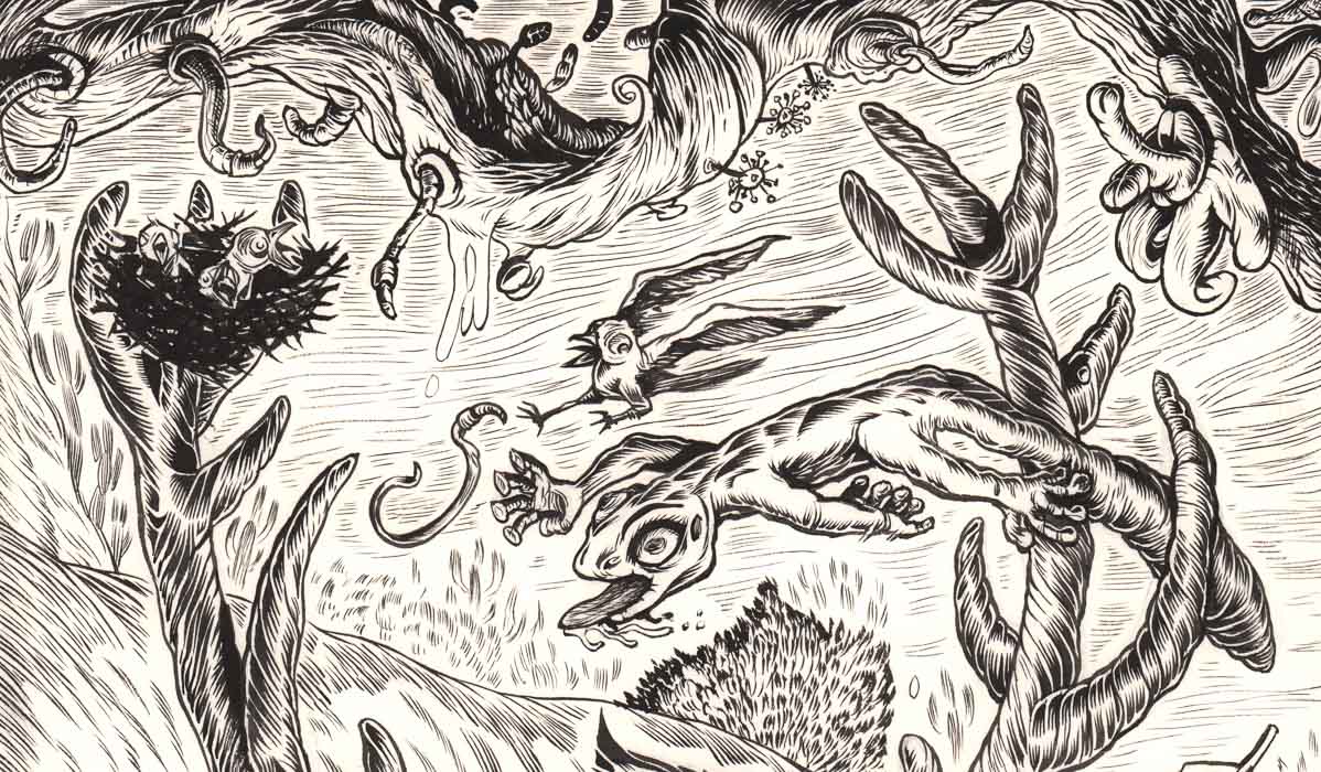 Une femme biche tatouée avec des cornes mange une sorte de poulpe phosphorescent, alors qu'un gecko était sur le point de gober le ver de terre d'un oiseau nourrissant ses petits.