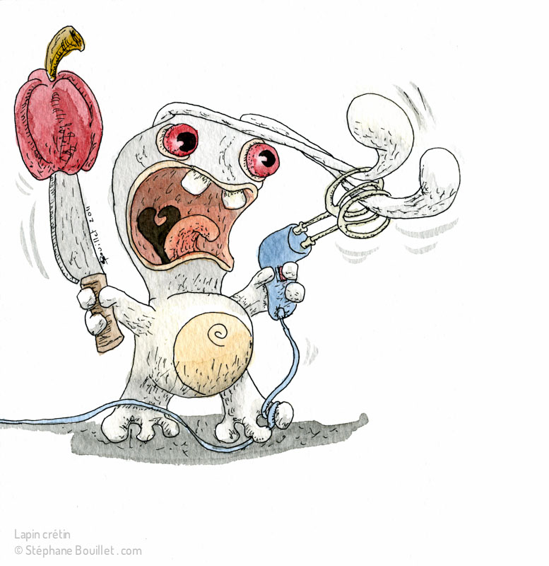 Un Lapin crétin cuisinier s’enroule les oreilles dans un batteur électrique