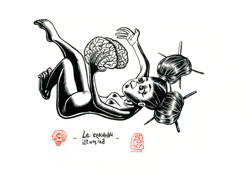 Une femme nue asiatique est en lévitation et tient entre ses mains un cerveau lumineux Elle a un double chignon à la manière japonaise, avec des baguettes dans les cheveux Dessin issu du billet de sasabudi "la sieste astrale"