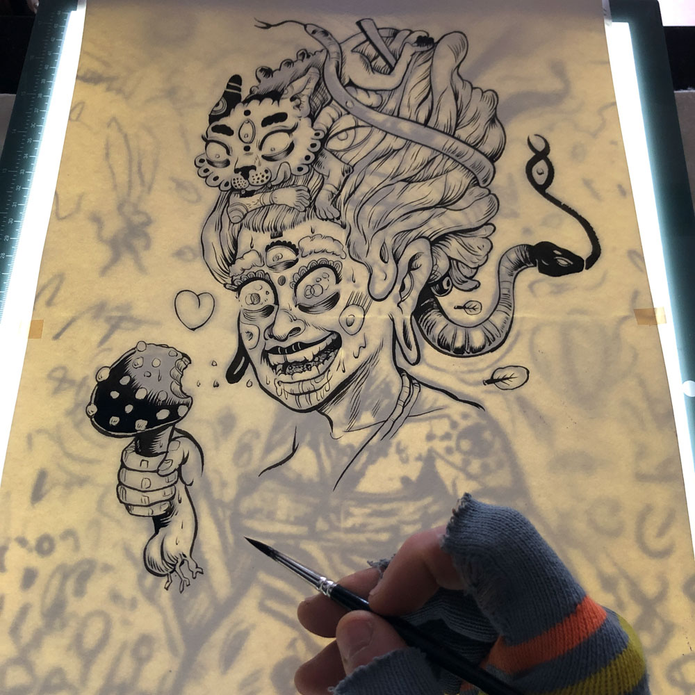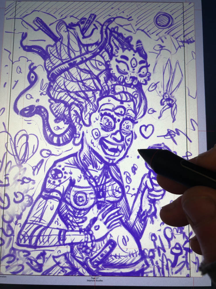 Des serpents lui sortent des cheveux entre deux baguettes chinoises.