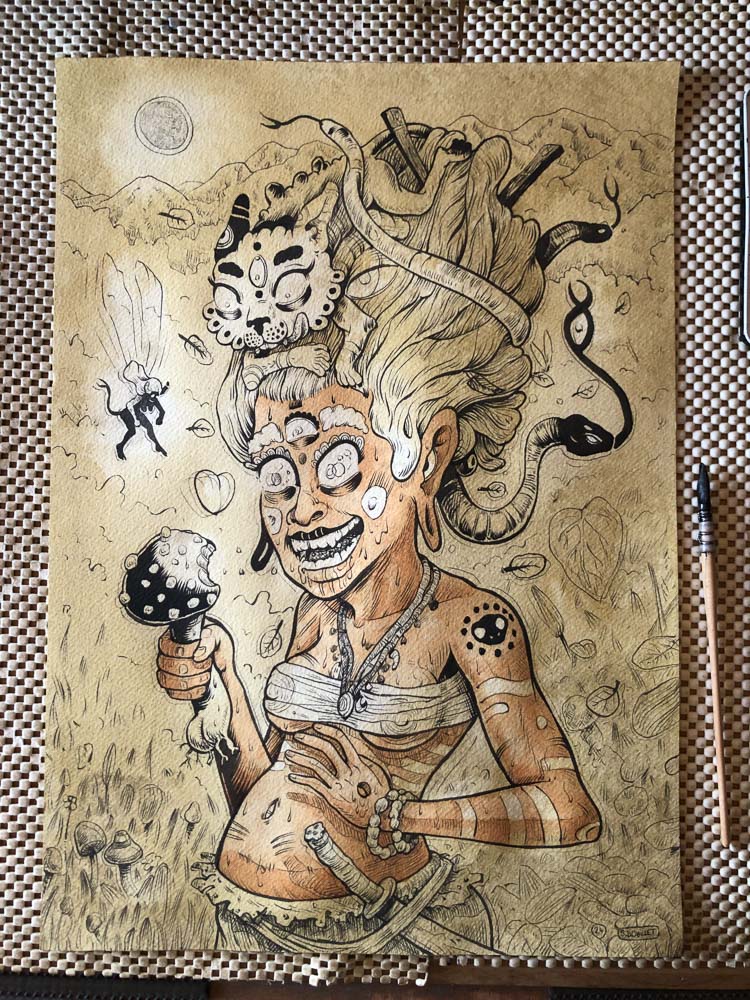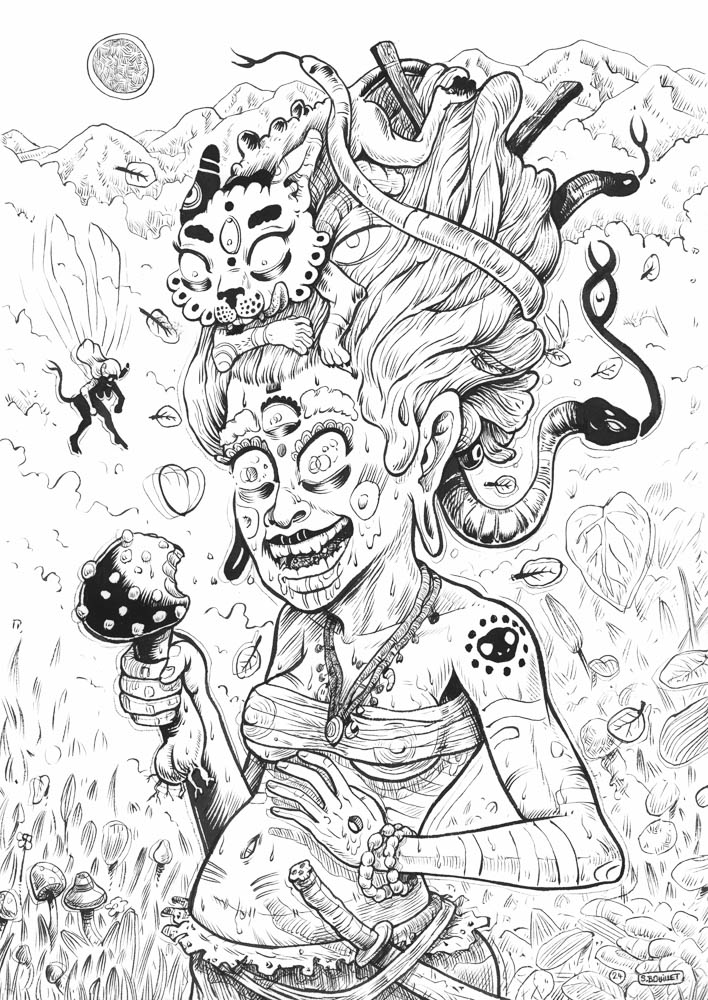 Une nuit de pleine lune, une jeune chamane aux dread locks rousses affublée d'un chat dans les cheveux, croque dans un champignon amanite tue-mouches et découvre les Mondes invisibles : trouble de la vision, vision extra lucide et en cinq dimensions etc. symbolisé par l'ouverture du troisième œil.