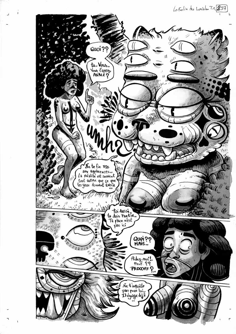 Planche originale de la page 237 du manga La Jungle Maudite, tome 1 de la série La Folie des Lucioles, offert avec cette planche. Le gros chat a avalé la fille de Melle K. Il est comme une statue de dieu, et se transforme peu à peu… Melle K. cherche le soutien du Prof., qui "voyage […]