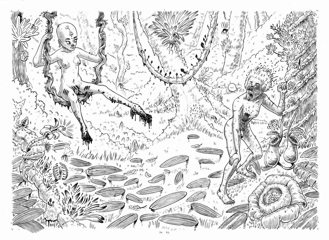 Prof, encore sous le choc de sa morsure, rencontre une nymphe sur une liane, qui lui tend ses pieds nus dont les orteils sont englués pas du liquide npoir et visqueux.