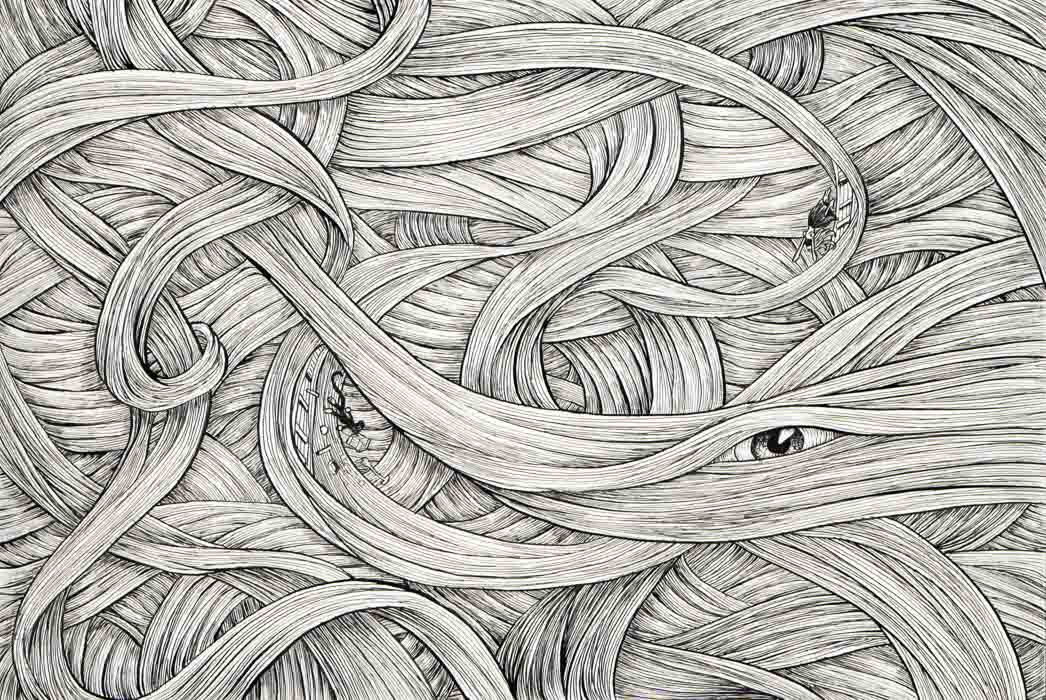 L'oeil entre deux vagues / cheveux est à la fois celui du voyeur que vous êtes devant cette illustration, et celle du troisième oeil, ou tout simplement la porte d'entrée / sortie de notre monde intérieur.