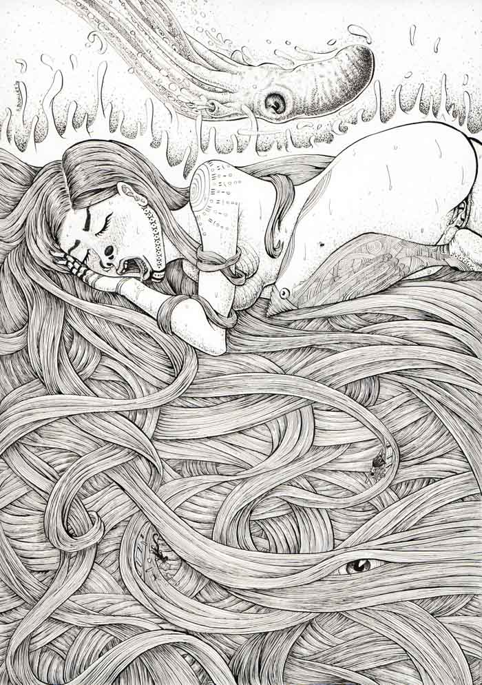 Une femme nue et tatouée se masturbe en pensant à un poulpe. Dans son fantasme, elle est également prise dans une tempête où les vagues qui sont ses propres cheveux, font chavirer sa barque et celle de son amoureux sous forme de singe. Son propre tourment serait donc à l'origine de son échec amoureux, ou au contraire du fait qu'ils vont se rejoindre dans l'adversité, malgré qu'ils partaient chacun sur une barque différente ?…