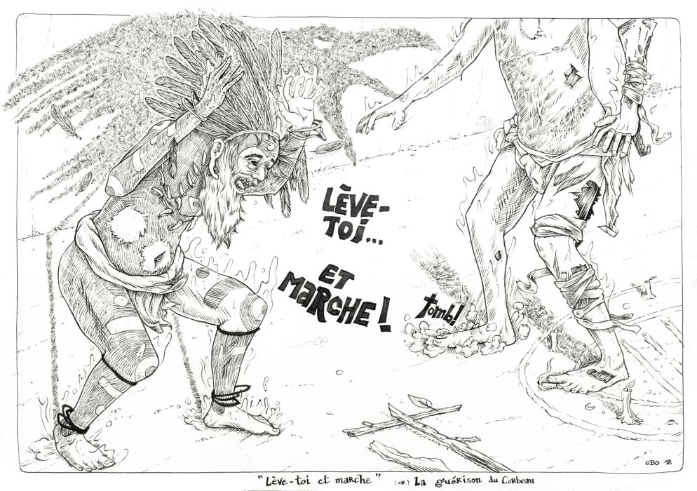 Ici, c'est à la fois le corbeau et la main blanche de Jésus qui touchent le paralysé et lui permette de se guérir et donc de se lever, de vaincre sa paralysie, alors que le chamane crie "Lève-toi… et marche !"
