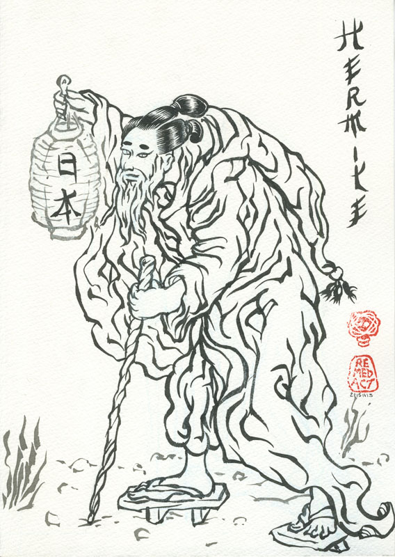 L'hermite japonais – carte VIIII du jeu de tarot Adptation libre de la lame majeur n°5, "l'hermite" du jeu de Tarot de Marseille, dans un style japonais.