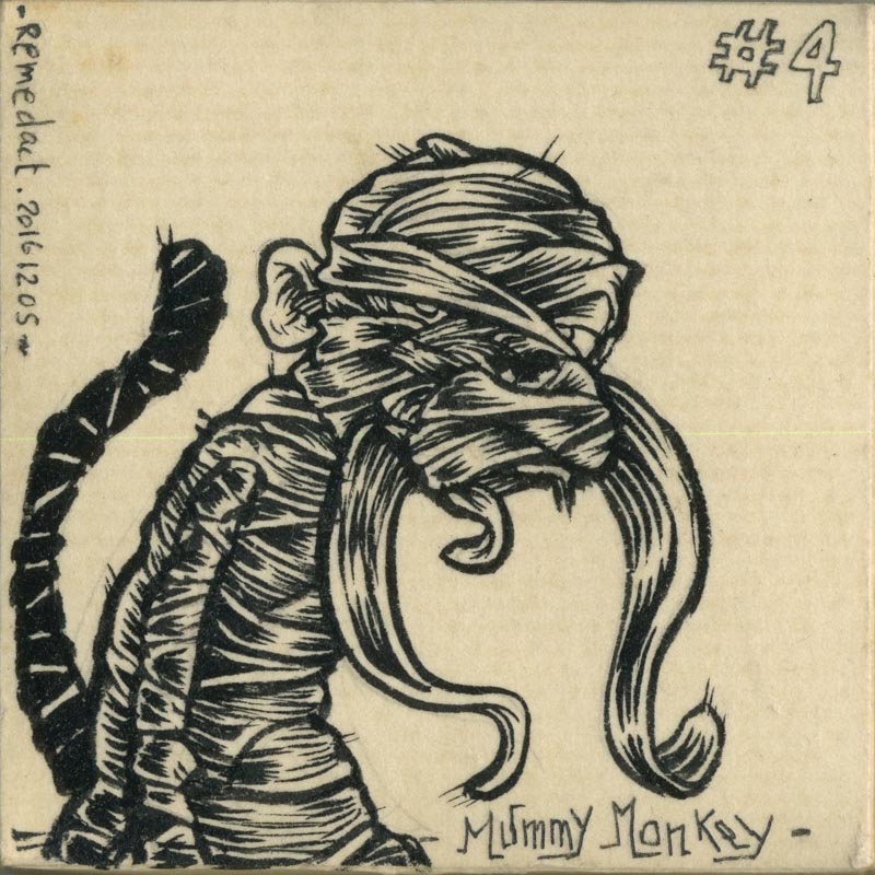 Une momie de ouistiti empereur est emballée de bandelette ; seules une oreilles et les moustaches dépassent.