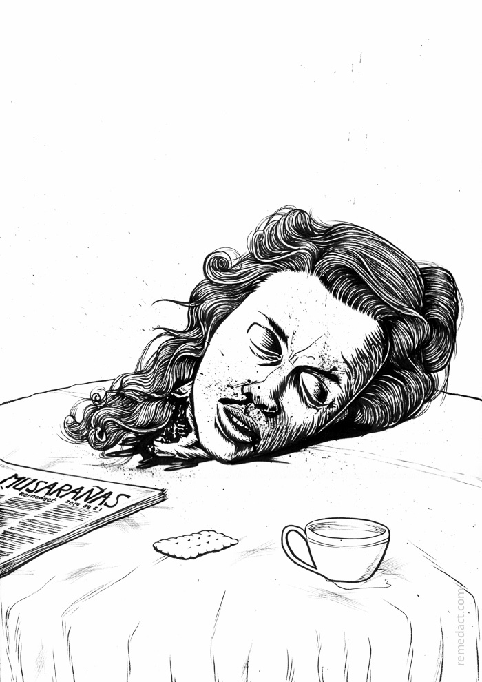 Dessin d'après l'affiche du film Musarañas : une tête de femme décapitée est posée sur une table à l'heure de la prise du thé et de la lecture du journal.