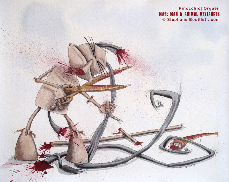Pinocchio est tiraillé par 2 péchés capitaux: l'envie d'être humain et l'orgueil, qui fait qu'il ne supporte plus du tout son nez à rallonge et ses oreilles d'âne, au point de décider de les couper…