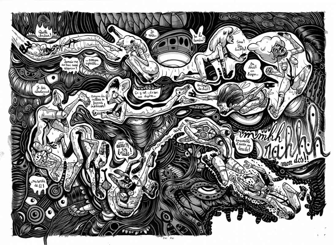 Cette double page m'a pris beaucoup de temps : nombreux personnages, variants au fur et à mesure du transit, visions chamaniques dignes d'hallucinations sous ayahuasca etc.