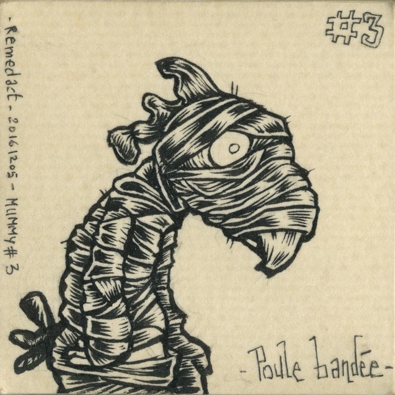Poule bandée, momie animale dont la crète et le bec dépassent