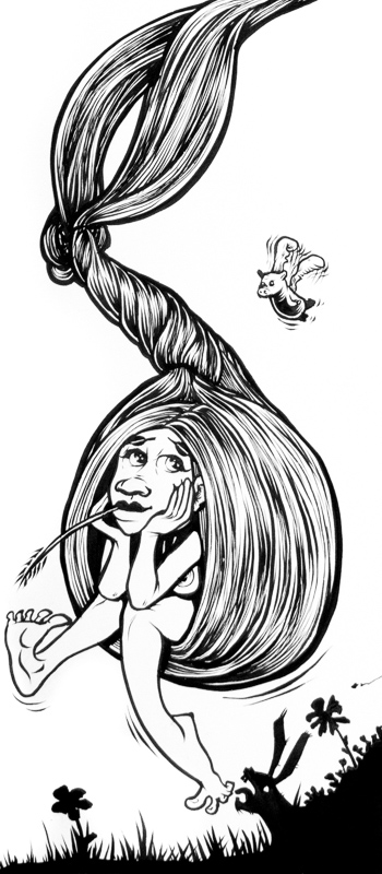 Raiponce se prélasse dans un jardin en se servant de ses cheveux comme d'une balançoire. Elle est nu et un lapin s'apprête à lui mordre les orteils de ses pieds nus, alors qu'elle est divertie par un ange-cochon volant au dessus d'elle. Elle attend désespérément le prince charmant qui ne vient pas. Raiponce (en allemand […]