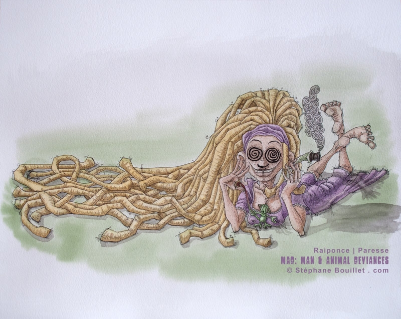 Raiponce en a par dessus la tête de ses cheveux super longs. Aussi a-t-elle décidé, entre 2 pétards, de ne plus du tout les coiffer. C'est naturellement qu'ils sont partis en longues dread locks, symbolisant pour certains (c'est un cliché) la paresse. Cette illustration fait partie de la série "MAD: Man & Animal Deviances", mêlant […]