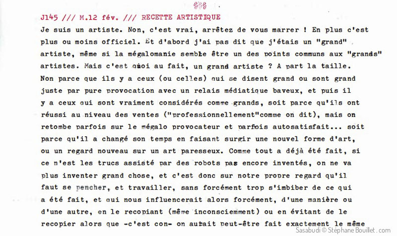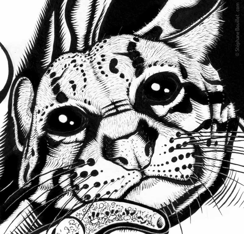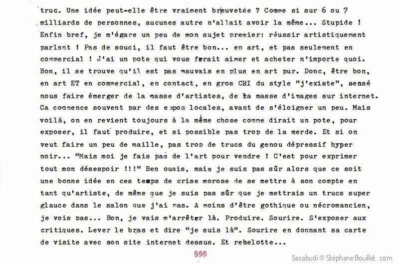 Portrait en noir et blanc du peintre Salvador Dali et de son ocelot Babou. Dali porte sa canne. Je suis un artiste. Non, c’est vrai, arrêtez de vous marrer ! En plus c’est plus ou moins officiel. Et d’abord j’ai pas dit que j’étais un « grand » artiste, même si la mégalomanie semble être un des points communs aux « grands » artistes. Mais c’est quoi au fait, un grand artiste ? À part la taille. Non parce qu’ils y a ceux (ou celles) qui se disent grandq ou sont grands juste par pure provocation avec un relais médiatique baveux, et puis il y a ceux qui sont vraiment considérés comme grands, soit parce qu’ils ont réussi au niveau des ventes (« professionnellement »comme on dit), mais on retombe parfois sur le mégalo provocateur et parfois autosatisfait… soit parce qu’ils ont changé leur temps en faisant surgir une nouvel forme d’art, ou un regard nouveau sur un art paresseux. Comme tout a déjà été fait, si ce n’est les trucs assisté par des robots pas encore inventés, on ne va plus inventer grand chose, et c’est donc sur notre propre regard qu’il faut se pencher, et travailler, sans forcément trop s’imbiber de ce qui a été fait, et qui nous influencerait alors forcément, d’une manière ou d’une autre, en le recopiant (même inconsciemment) ou en évitant de le recopier alors que -c’est con- on aurait peut-être fait exactement le même truc. Une idée peut-elle être vraiment breuvetée ? Comme si sur 6 ou 7 milliards de personnes, aucune autre n’allait avoir la même… Stupide ! Enfin bref, je m’égare un peu de mon sujet premier: réussir artistiquement parlant ! Pas de souci, il faut être bon… en art, et pas seulement en commercial ! J’ai un pote qui vous ferait aimer et acheter n’importe quoi. Bon, il se trouve qu’il est pas mauvais en plus en art pur. Donc, être bon, en art ET en commercial, en contact, en gros CRI du style « j’existe », sensé nous faire émerger de la masse d’artistes, de la masse d’images sur internet. Ça commence souvent