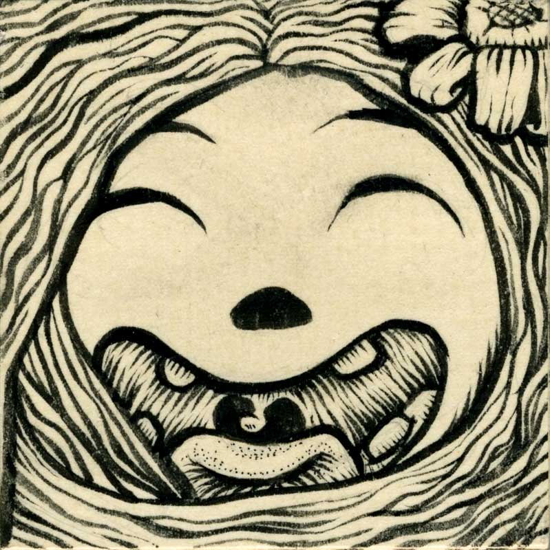 Portrait d’une jeune fille riant aux éclats, avec une fleur dans les cheveux
