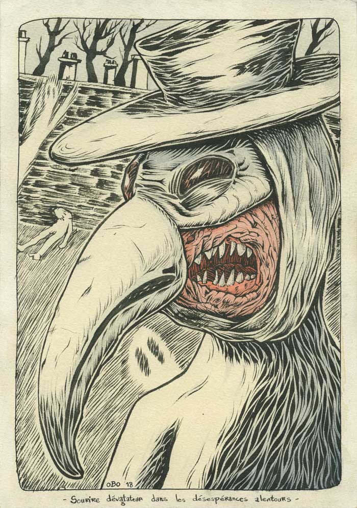 1348 : la peste noire rentre dans Paris, vêtue de blanc, exhibant son sourire dévastateur dans les désespérances alentours, sous son masque d'oiseau.