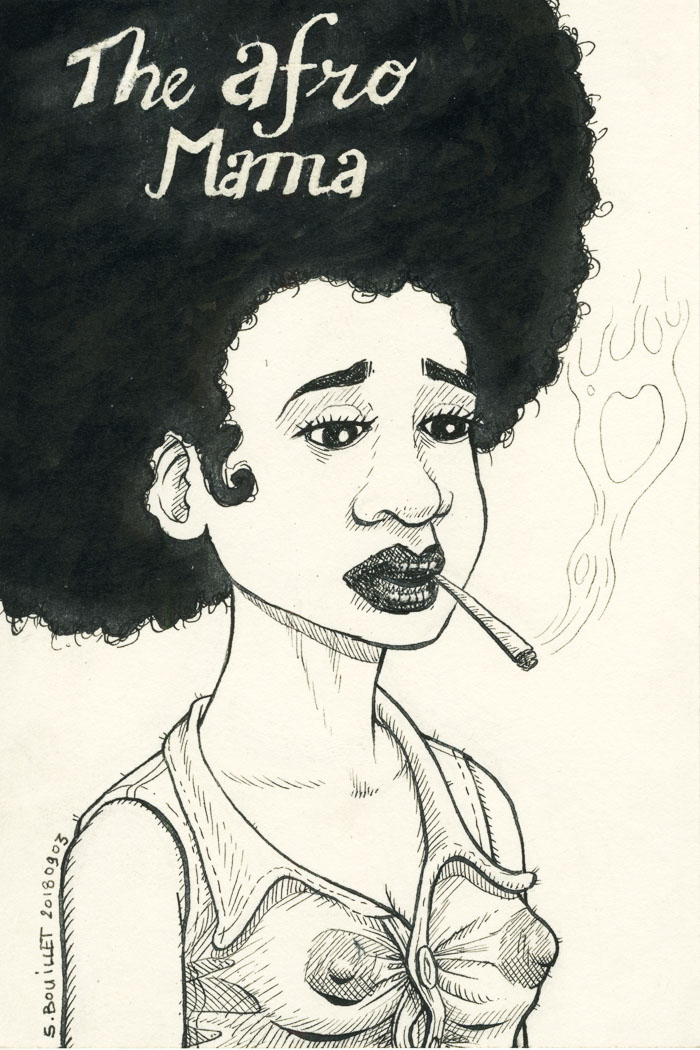The afro mama, comme on l'appelle dans ce bas quartier, fume une cigarette sur le trottoir. On la reconnait facilement grâce à sa coupe afro énorme, et ses seins nus sous son chemisier trop petit.