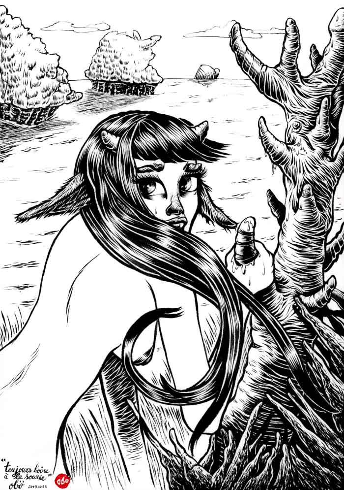 Une femme nue aux oreilles et petites cornes boit du liquide à la source d’une espèce de cactus aux formes phalliques, simulant une fellation, sur fond de mer aux allures de la Baie d’Ha Long.