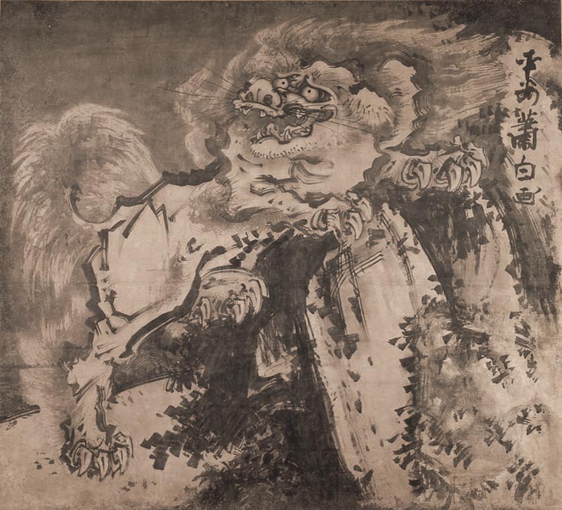 Soga Shōhaku est un des peintres les plus originaux du Kyôto, qui ont marqué une époque dite rhapsodique à la dernière moitié du XVIII ème siècle. Né à l'ancienne capitale dans une famille bourgeoise, il serait devenu peintre dans sa trentaine. Ses ouvrages géniaux pleins d'ironie et de révolte ont été chaleureusement accueillis non seulement à sa ville natale mais aussi dans les zones rurales avancées. Ses ouvrages sont pleins d’esprit et d'humour, mais aussi d'amertume. Sa révolte contre les autorités déjà faites se trouve à la racine de son apparente mégalomanie: il se présente tantôt comme le dixième successeur d'un grand peintre, tantôt comme un descendant d'un empereur chinois. Il fait tout cela pour railler ce qu'on estima dans ce monde. Les tigres, les lions, et même les dragons ne sont ni dignes, ni puissants. Il s sont inquiets, effrayés par un papillon ou par un herbe qui vacille dans le vent. Leur physionomie piteuse est surtout impressionnante.