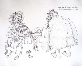 Astérix prend très mal les réflexions de Cléopâtre, tant il est orgueilleux. Obélix et Idéfix compatissent.
