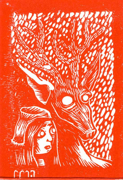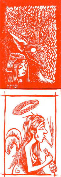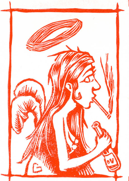 Ici, l'ange porte des ailes, une auréole, un tatouage de coeur sur une fesse, une bouteille de vodka et fume une cigarette. L'animal est une biche ou un cerf